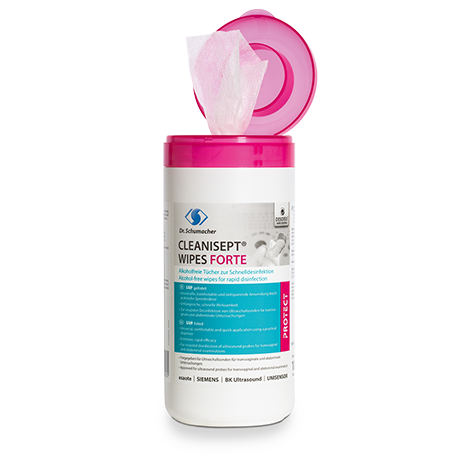 Cleanisept wipes forte sind alkoholfreie, gebrauchsfertige Desinfektionstücher zur viruziden Desinfektion und Reinigung von Medizinprodukten und medizinischem Inventar. Cleanisept wipes forte ermöglichen insbesondere bei der Desinfektion und Reinigung von Ultraschallköpfen für transvaginale und transrektale Untersuchungen eine praxisnahe und zeitsparende Anwendung. Sie sind alkoholfrei und enthalten weder Aldehyde noch Phenole. Die Tücher lassen sich einzeln aus der praktischen und wiederverschließbaren Spenderdose entnehmen. Cleanisept wipes forte basieren auf einer anwenderfreundlichen Zusammensetzung. Trotz der umfangreichen und schnellen Wirksamkeit, übergreifend innerhalb 2 Minuten, ist das Produkt geruchlos und weist eine sehr gute Materialverträglichkeit auf.