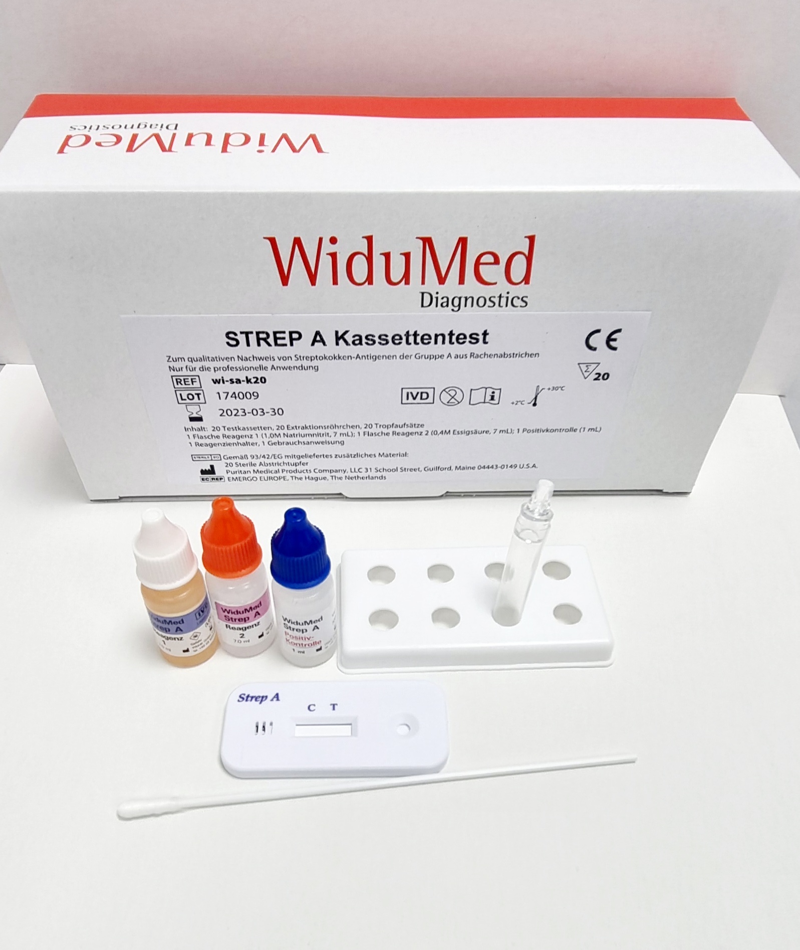 Der WiduMed StrepA Streifentest ist ein schneller visueller Immunoassay für den qualitiven, präsumptiven Nachweis von Streptokokken- Antigenen der Gruppe A (Strep A) in humanen Rachenabstrichproben.