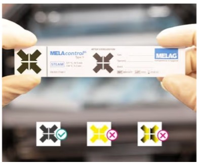 Indikator nach EN ISO 11140-1 zur Überprüfung der Sterilisationsbedingungen (Dampf, Temperatur und Zeit). Der Indikator kann sowohl verpackten Instrumenten (z.B.in MELAfol, MELAstore) beigelegt, als auch direkt im Kessel platziert werden.