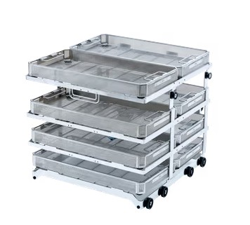 Gemacht für große Aufgaben mit MELAtherm 20: Mit dem Beladungswagen für bis zu 8 DIN-Siebe (Abmessung: LxBxH 53,8 x 51,2 x 43,2 cm) bietet MELAG die ideale Lösung für ambulante OP-Zentren und chirurgische Kliniken mit hohem Instrumentendurchsatz.