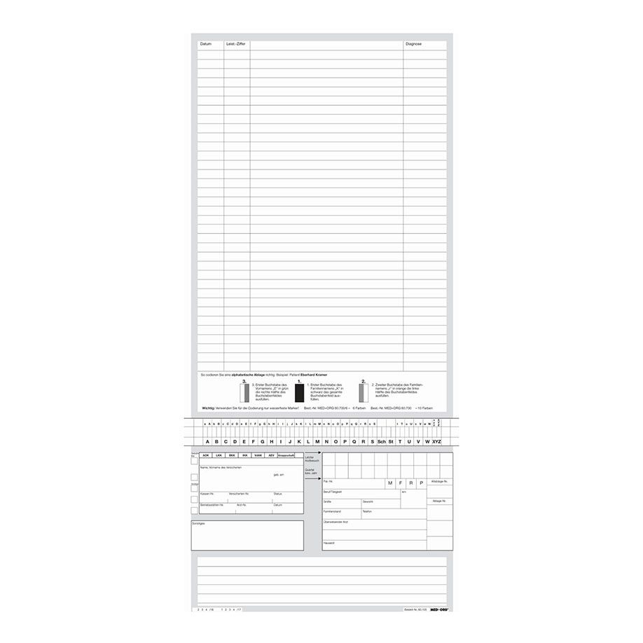 - Weiß, 180 g Computerkarton- holzfrei- extra zäh- 4 Quernutungen (1 x oben, 3 x unten)- plan verpackt- Adressfeld gemäß eGK- Klebefeld für Abheftstreifen - Wird zur Anwendung 2 x gefaltet. - Maße aufgeklappt 442 x 210 mm, gefaltet bis 164 x 210 mm.