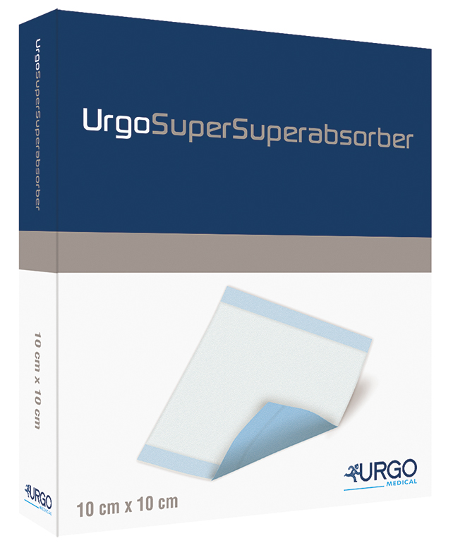 UrgoSuperSuperabsorber hat eine blaue hydrophobe Rückseite (Seite nach außen), um das Auslaufen von Feuchtigkeit zu minimieren, und eine weiße Wundkontaktschicht, die einen atraumatischen Verbandwechsel ermöglicht.